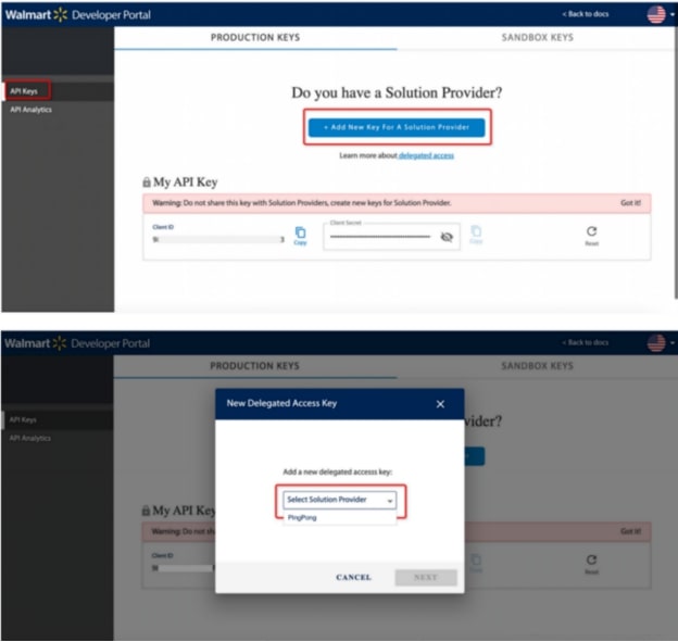 (1)在页面左侧菜单选择“API”Keys,然后在“PRODUCTION KEYS” Tab页下点击“Add New Key For A Solution Provider”按钮,在弹出框中选择服务商为PingPong